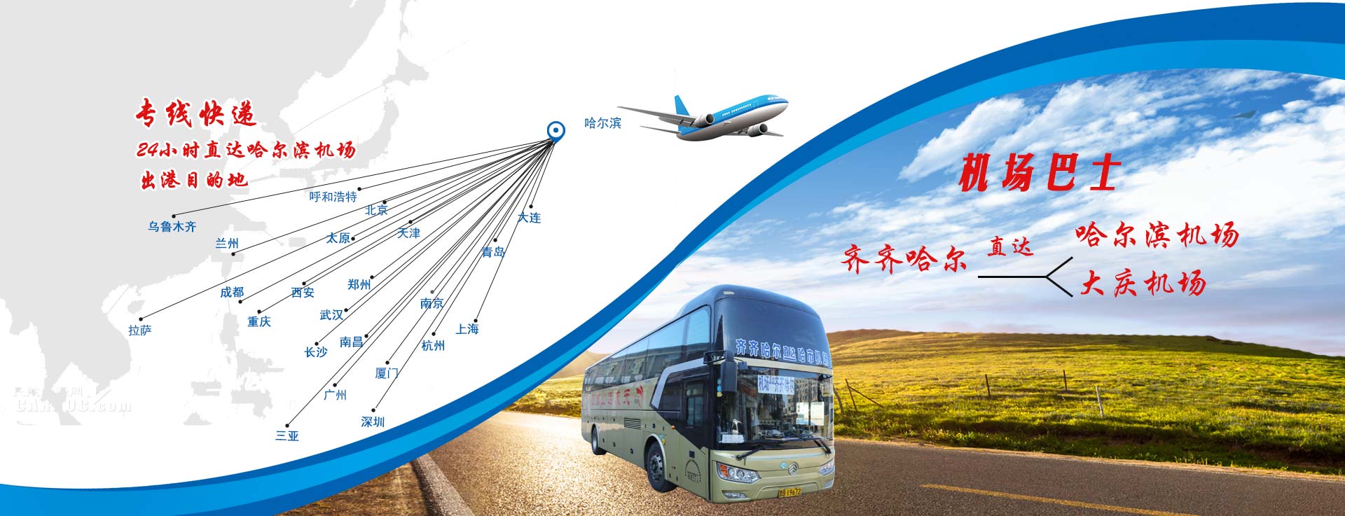 黑龍江天成運(yùn)業(yè)集團(tuán)齊齊哈爾客運(yùn)有限公司機(jī)場(chǎng)巴士往返于齊齊哈爾與哈爾濱太平國(guó)際機(jī)場(chǎng)間,全程運(yùn)行約3小時(shí)50分鐘。行程360公里,中途在大慶紅湖服務(wù)區(qū)停靠5分鐘,大慶機(jī)場(chǎng)可上下。