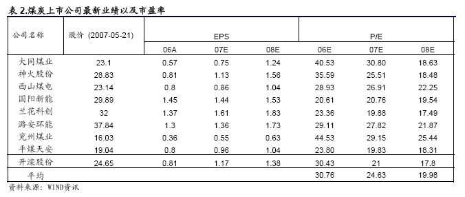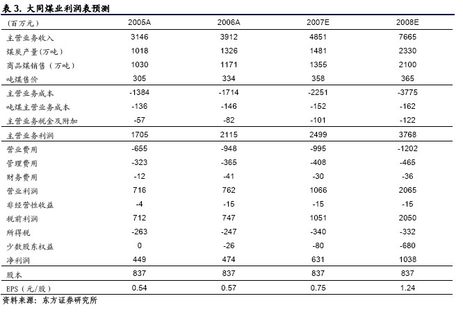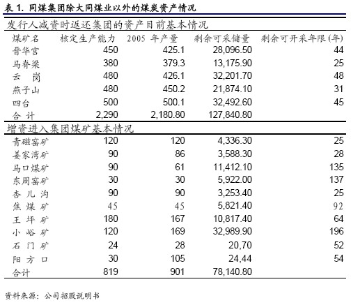 2006 年公司的年報(bào)指出,公司未來(lái)的資源獲取以及上市公司的發(fā)展戰(zhàn)略進(jìn)一步明確。一是通過(guò)境外上市及境內(nèi)增發(fā)融資,收購(gòu)整合煤炭資源和開(kāi)發(fā)新煤礦并舉的形式,實(shí)現(xiàn)公司的產(chǎn)能擴(kuò)張。同煤集團(tuán)十一五規(guī)劃的產(chǎn)能是1.5 億噸。2014 年前會(huì)全部放進(jìn)上市公司,大同煤業(yè)將是同煤集團(tuán)下屬企業(yè)中唯一經(jīng)營(yíng)煤炭采選業(yè)務(wù)的經(jīng)營(yíng)主體。公司成長(zhǎng)性日顯突出。云崗礦是集團(tuán)下屬礦井中質(zhì)地較好的礦井,剩余可采儲(chǔ)量3.22億噸,可采年限48 年,盡管公司此次收購(gòu)的云崗礦界內(nèi)的煤田規(guī)模不大。我們預(yù)期更大規(guī)模的收購(gòu)資產(chǎn)可能會(huì)在公司發(fā)行港股的時(shí)候?qū)嵤?BR> 公司將發(fā)行港股的計(jì)劃,與我們前期所了解到的情況以及前期跟蹤報(bào)告《大同煤業(yè)-發(fā)行港股或可加速公司成長(zhǎng)》所述相符。發(fā)行港股所籌資金將用于收購(gòu)集團(tuán)資產(chǎn)。目前同煤集團(tuán)晉華宮礦、馬脊梁礦、云崗礦、燕子山礦、四臺(tái)礦、精煤公司等相關(guān)的全部經(jīng)營(yíng)性資產(chǎn)和同煤集團(tuán)擁有52.44%股權(quán)的軒崗煤電都委托大同煤業(yè)進(jìn)行經(jīng)營(yíng)管理。公司如果發(fā)行H 股,有望收購(gòu)上述資產(chǎn),煤炭產(chǎn)量有望在2006 年1326 萬(wàn)噸的基礎(chǔ)上增長(zhǎng)2670 萬(wàn)噸左右。